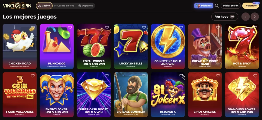 VinciSpin ofrece un catálogo impresionante de juegos que satisface todos los gustos y se posiciona como uno de los nuevos casino online más completos del mercado. Desde máquinas tragamonedas clásicas hasta juegos de mesa modernos, hay opciones para cada tipo de jugador. La variedad incluye slots, ruletas, blackjack y juegos de casino en vivo.